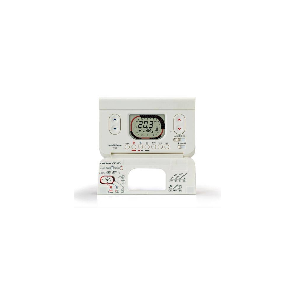 - Intellitherm C57 viene fornito con uno zoccolo adatto per il montaggio su scatole da incasso a 3 moduli, tonde o per montaggio a parete, la sporgenza dell’apparecchio è minima e l’ambientazione ancora più facilitata.