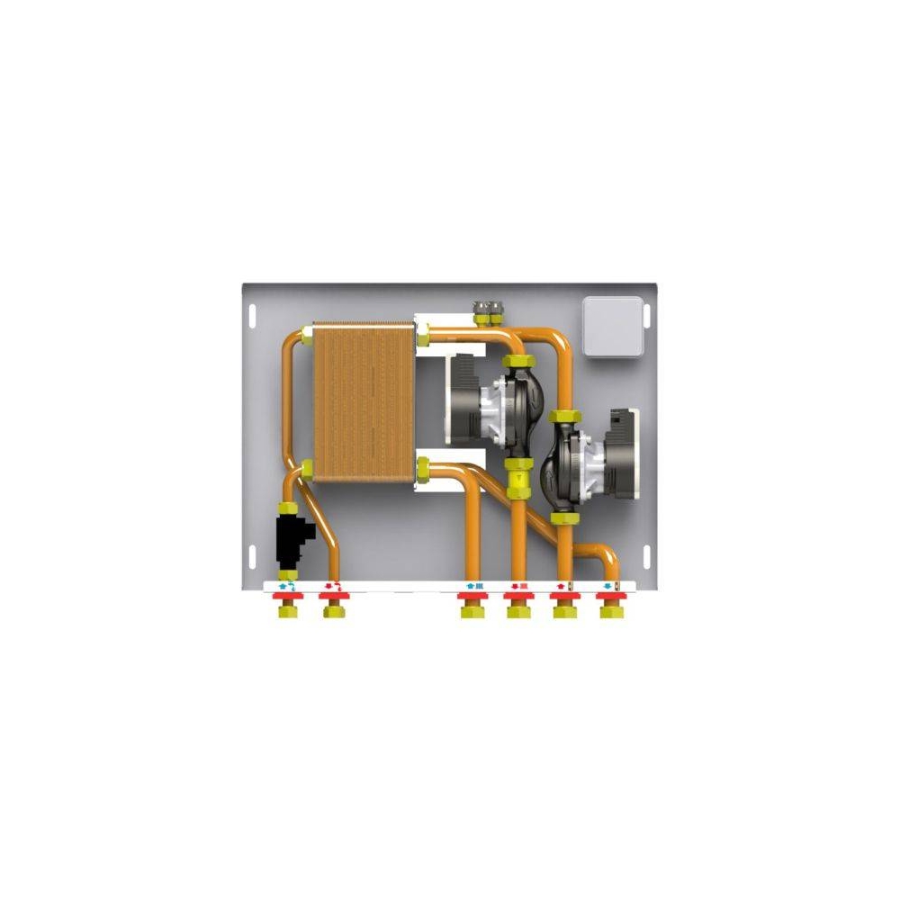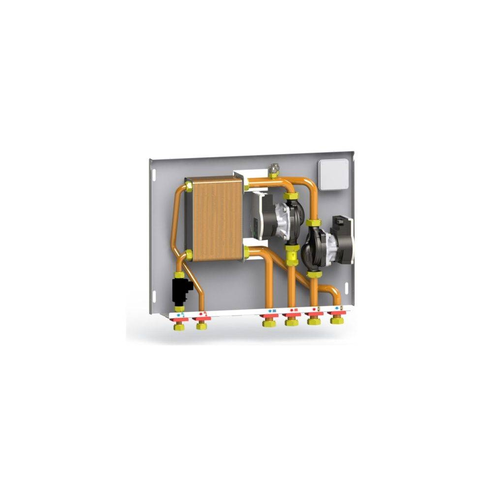 Tramite il modulo è possibile effettuare la funzione di riscaldamento dell’unità abitativa sfruttando il calore sia da caldaia a combustibile solido (a vaso aperto o chiuso) sia da caldaia a gas, separando idraulicamente i due circuiti tramite scambiatore a piastre, per evitare di sommare le potenze dei due generatori secondo quanto richiesto dalle norme INAIL (ex ISPESL). Il modulo è munito da uno o due circolatori, uno scambiatore, due valvole di sfogo aria, una valvola di non ritorno e kit di fissaggio a parete. il box di copertura è incluso.