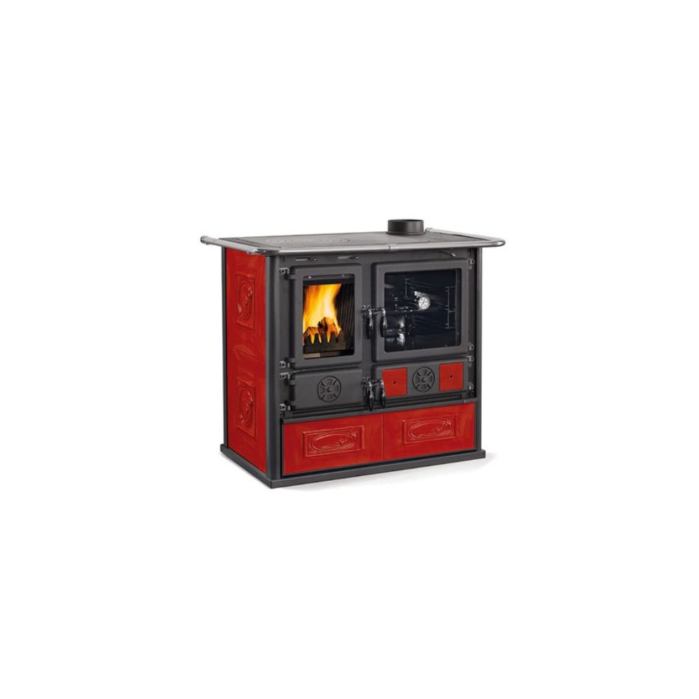 Cucina economica a legna con rivestimento in ceramica - Focolare in ghisa • Porte e telaio in ghisa smaltata • Facciata in acciaio smaltato • Cassetto cenere estraibile • Aria primaria e secondaria regolabile per migliore gestione combustione • Sistema di post-combustione per basse emissioni • Vetro ceramico • Cassettone porta legna • Uscita fumi superiore destra o posteriore..