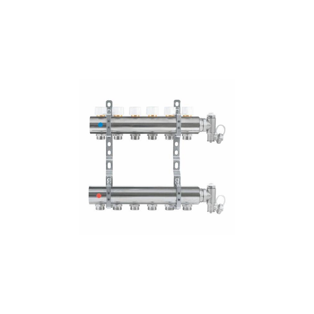 Sono disponibili modelli da 2 a 13 uscite con attacchi principali da 1”¼ , e attacchi derivati da 3/4” Eurocono. I collettori di distribuzione sono ricavati da barra d’ottone trafilato con profilo speciale in CW617N alla quale viene effettuato un trattamento termico di distensione. I collettori sono lavorati e assemblati internamente su macchinari automatici e testati al 100% con i relativi accessori montati per avere una assoluta certezza di tenuta. Le filettature degli attacchi alle colonne principali sono eseguite a norma ISO228. Le tubazioni di derivazione sono collegate per mezzo di raccordi montati sul collettore a tenuta con o-ring e incollati per evitare l’eventuale svitamento in