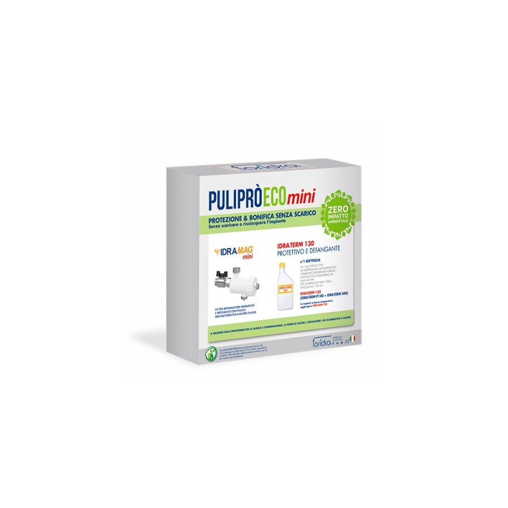 Il pacchetto PULIPRÒ ECO MINI contiene il filtro defangatore IDRAMAG MINI e IDRATERM 130 idoneo a risanare e proteggere con la tecnologia SCARICO ZERO n.1 appartamento (80 – 100 m²) con basso contenuto di ossidi metallici.