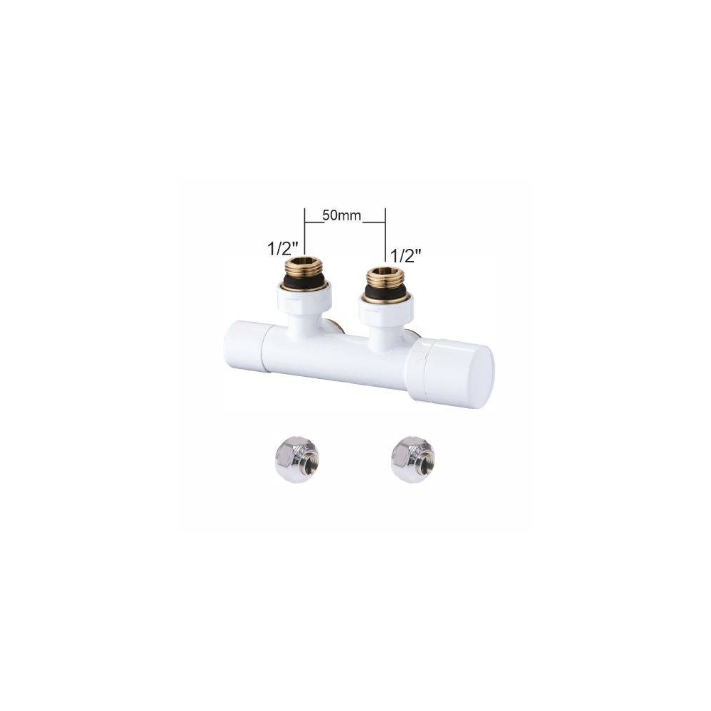 Valvola termostatica bianca interasse 50mm per radiatori con adattatori 1/2" x 1/2" tubo rame D. 10