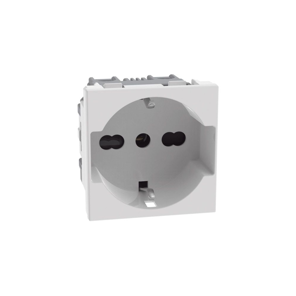 Presa standard Italia P40 2 P+T 16 A 250 Va.c. - interasse 19 mm e 26 mm in configurazione bipasso - alveoli protetti; contatti laterali di terra per spine standard tedesco; adatta per spine standard Italia 2 P e 2 P+T 10/16 A, spine standard tedesco 2 P+T 16 A - 2 moduli - bianco