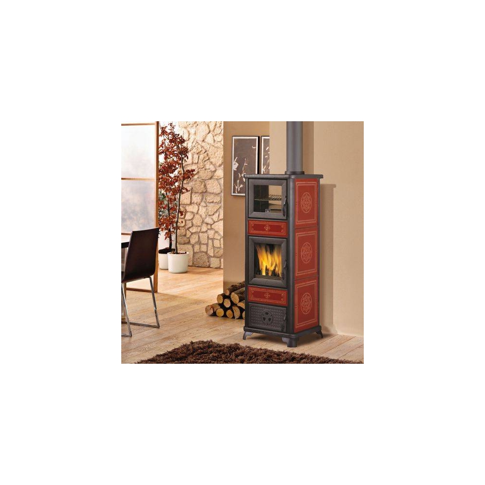 Stufa a legna rustica in ceramica con struttura in acciaio e focolare in ghisa. Frontale e top in ghisa smaltata con pratici anelli asportabili per poter scaldare pietanze. Il forno, in acciaio inox, ha dimensioni interne cm 27x30x24h. Colore bordeaux