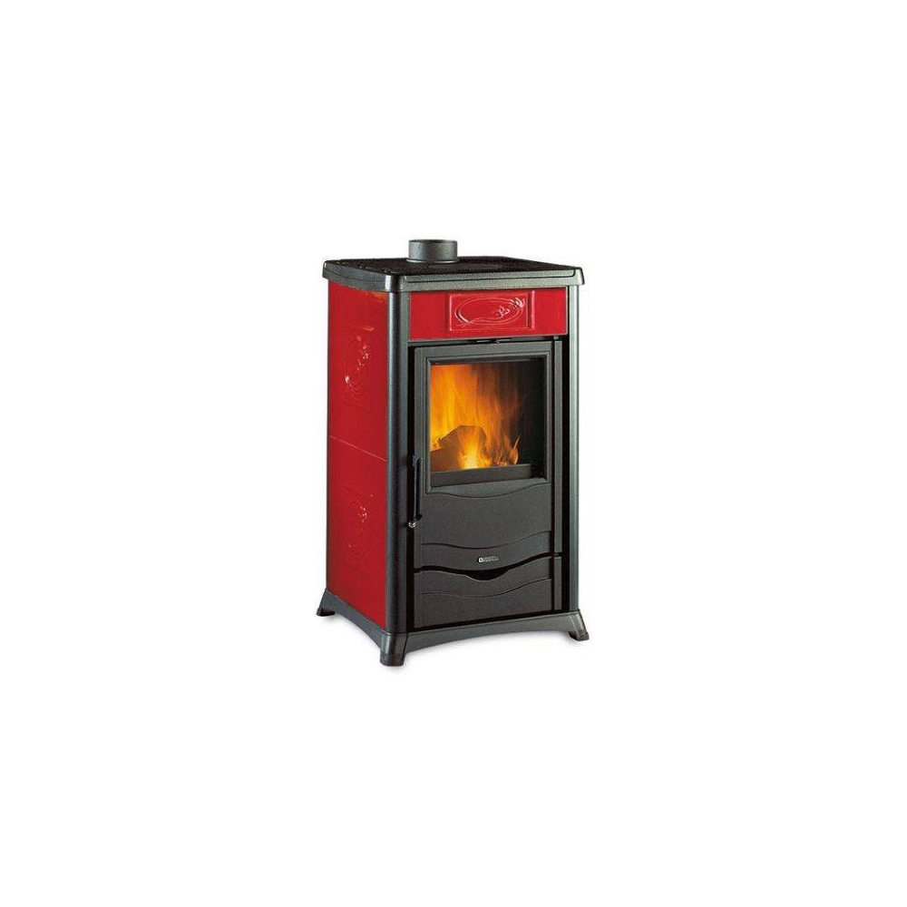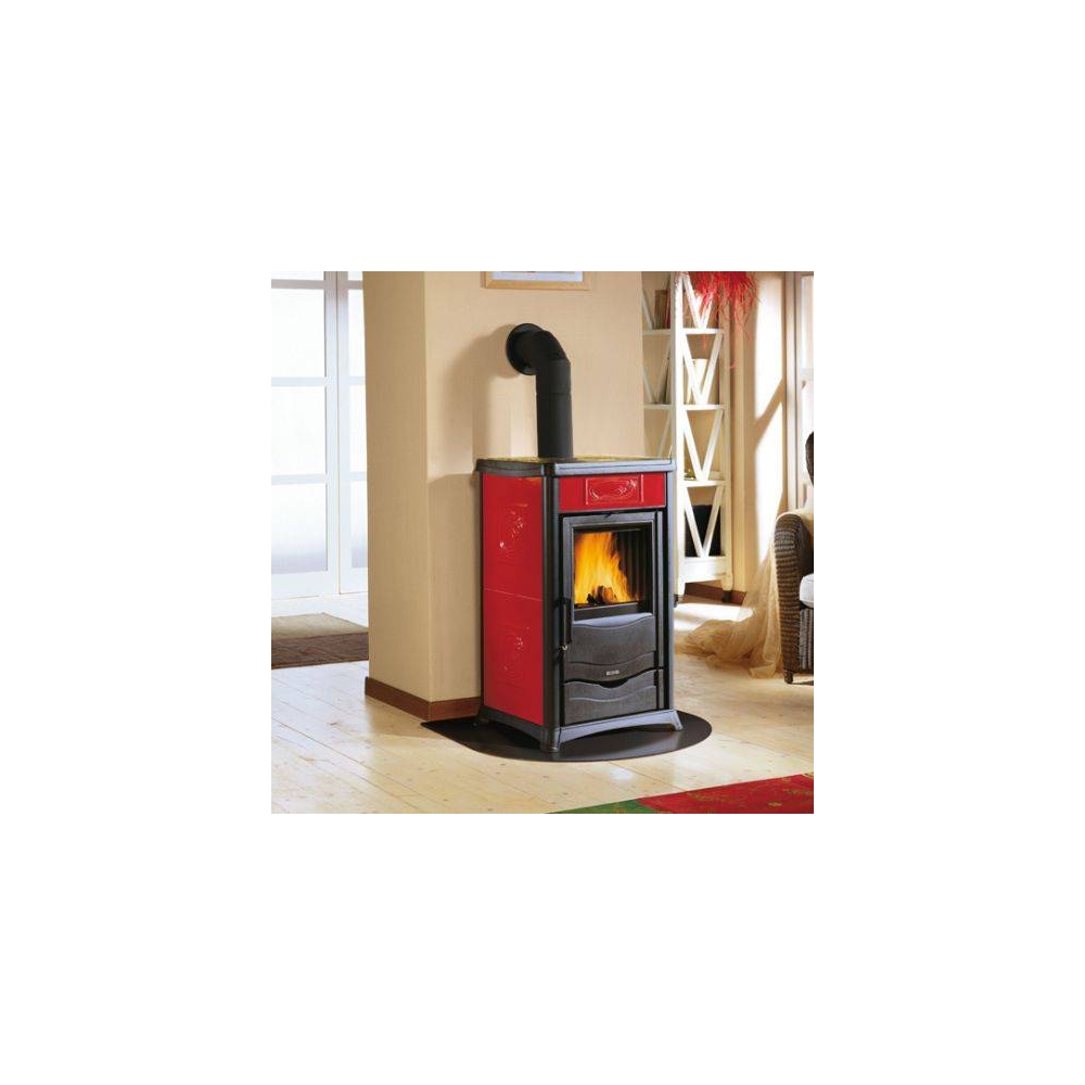 La stufa a legna Rossella plus: Rivestimento esterno in maiolica - Focolare in ghisa - porta, telaio, basamento e testata in ghisa smaltata - cassetto cenere estraibile - aria primaria e secondaria regolabile per migliore gestione combustione - sistema di post-combustione per basse emissioni - vetro ceramico - cassetto porta legna - lunghezza max legna 30 cm