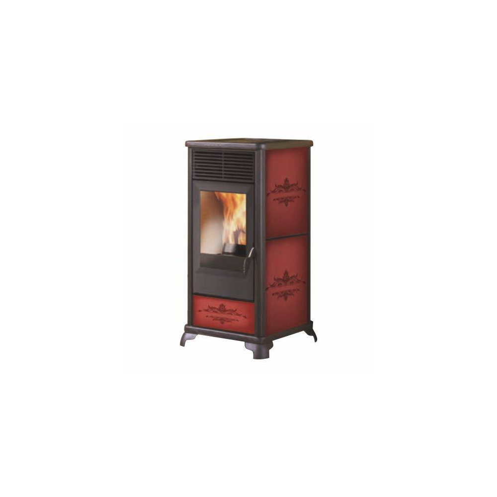 Stufa a pellet con porta e griglia uscita aria calda in ghisa, inserto frontale e fianchi in ceramica bordeaux.
