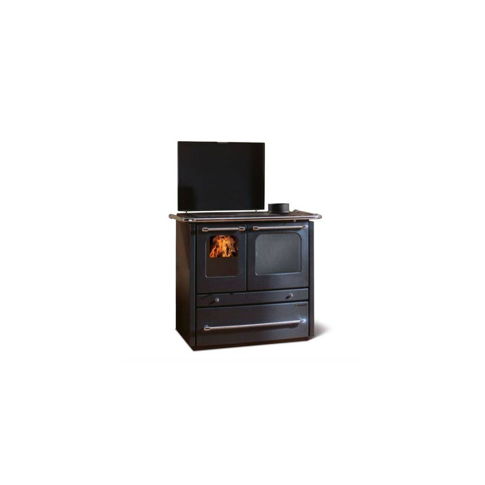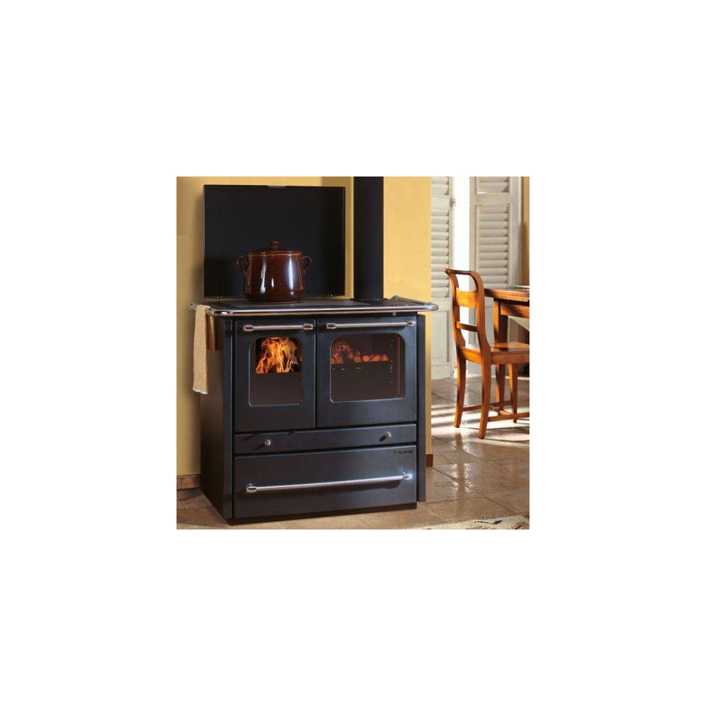 Termocucina Nordica a legna con rivestimento esterno in acciaio porcellanato - Focolare in acciaio e ghisa - porte in acciaio smaltato - Facciata e telaio in ghisa smaltata - piastra e cerchi in ghisa levigata - cassetto cenere estraibile - aria primaria e secondaria regolabile per migliore gestione combustione - sistema di post-combustione per basse emissioni - vetro ceramico - cassettone porta legna - forno in acciaio smaltato porcellanato da 41 l - predisposizione per dispositivo di sicurezza DSA (valvola DSA optional) - uscita fumi superiore destra o posteriore - pressione d’esercizio 3 bar - lunghezza max legna 30 cm