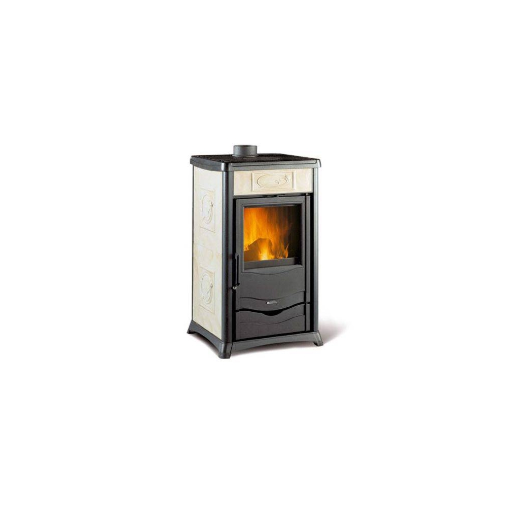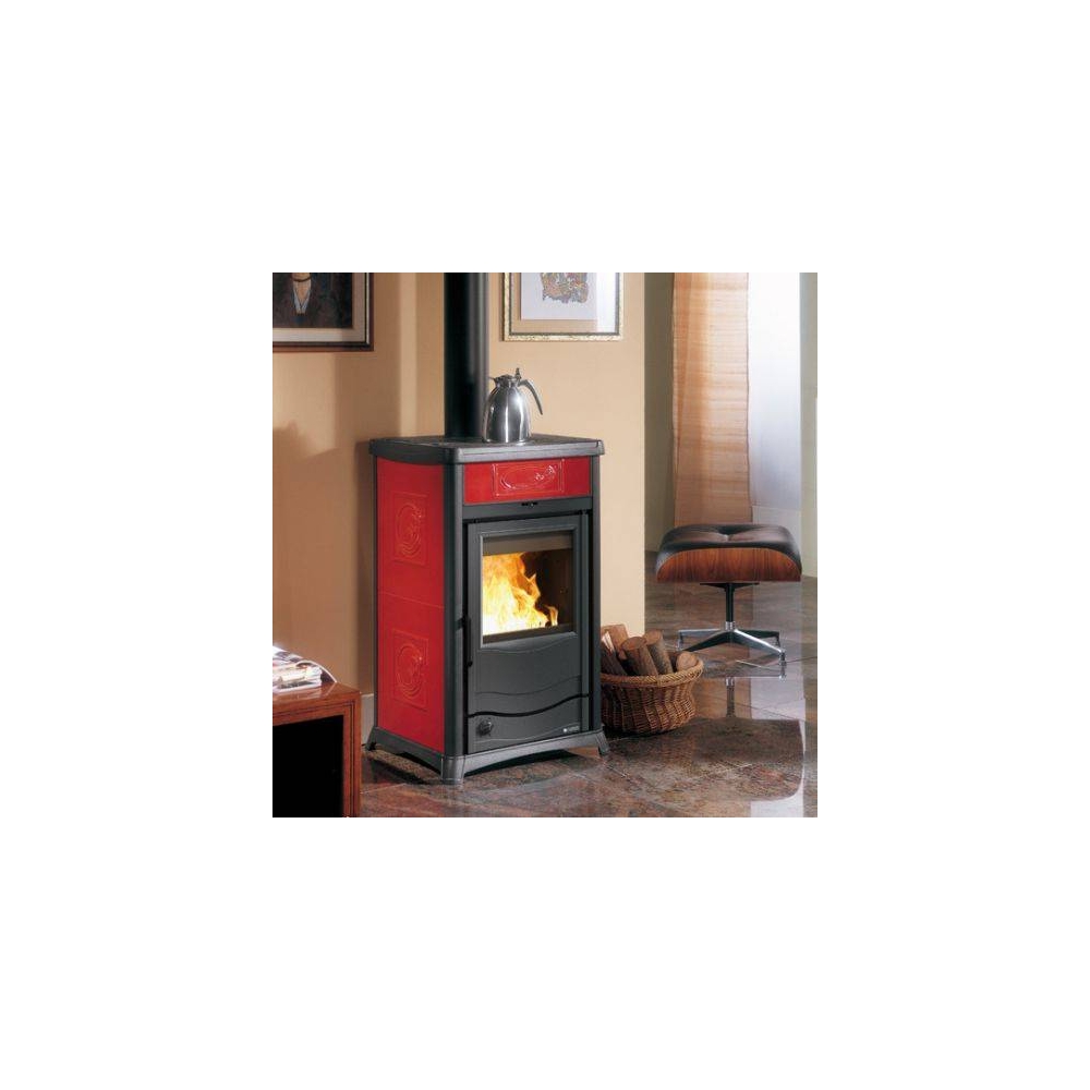 La termostufa a legna Termorossella plus: Rivestimento esterno in maiolica - Focolare in ghisa / acciaio - porta - cassetto cenere estraibile - aria primaria e secondaria regolabile per migliore gestione combustione - sistema di post-combustione per basse emissioni - valvola termostatica aria - vetro ceramico -predisposizione per dispositivo di sicurezza DSA (valvola DSA optional) - lunghezza max legna 30 cm - pressione d’esercizio 3 bar
