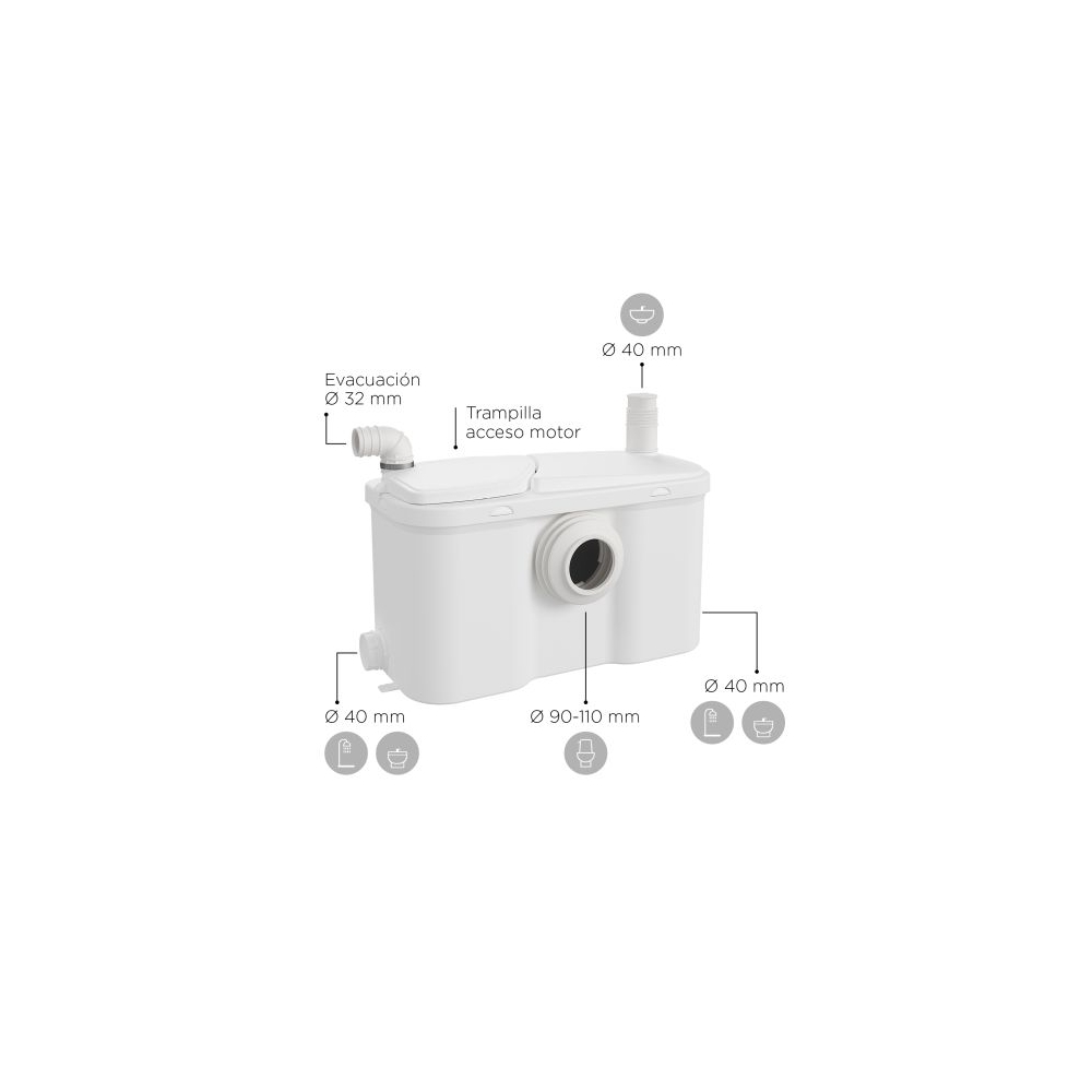 Il SFA Watersan 3 è un trituratore sanitario progettato per consentire l'installazione di un bagno completo senza la necessità di interventi invasivi. Questo dispositivo compatto e potente permette di collegare fino a quattro utenze: WC, lavabo, bidet e doccia